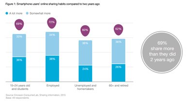 Internet w prosty sposób pozwala użytkownikom na dzielenie się swoimi przeżyciami z bliskim lub dalszym otoczeniem. Ponad 70 procent wszystkich osób posiadających smartfony regularnie publikuje swoje zdjęcia, a co trzeci z nich udostępnia tworzone przez siebie materiały wideo. Wielu użytkowników smartfonów udostępnia treści bez wahania i zastanowienia. 69 procent z nich przyznaje że dzieli się większą ilością treści niż dwa lata temu. Najwięcej materiałów publikują osoby młode i pracujące.