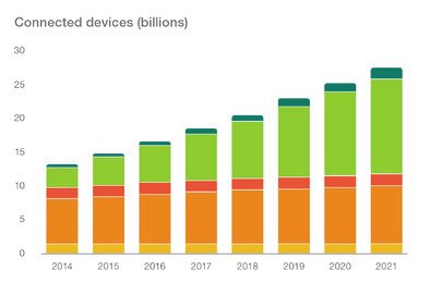Spodziewamy się że w latach 2015 i 2021, liczba urządzeń IoT będzie wzrastać o 23 procent rocznie, za wzrost w największym stopniu będą odpowiadać komórkowe urządzenia IoT. W 2021 roku, z łącznej liczby 28 miliardów urządzeń podłączonych do internetu, 16 miliardów będzie należało do kategorii IoT.
