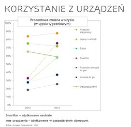Jak wynika z najnowszego raportu Ericsson ConsumerLab, Polacy coraz chętniej korzystają z urządzeń mobilnych - tabletów i smartfonów. Od roku 2013 do 2015 liczba osób używających smartfonów przynajmniej raz w tygodniu, wzrosła ponad dwukrotnie, osiągając poziom 76 procent populacji. Dzięki smartfonom zwiększa się również wykorzystanie poszczególnych usług mobilnych. Na czele usług które Polacy wykorzystują najczęściej, znalazły się: przeglądanie internetu, e-mail i social media. Popularność komputerów stacjonarnych stopniowo maleje. Przyczyną może być częstsze korzystanie z laptopów, które są urządzeniami wygodniejszymi w codziennym wykorzystywaniu.