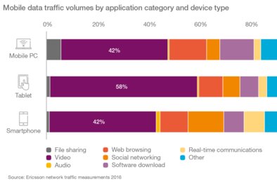 Ruch danych w sieciach mobilnych w dalszym ciągu rośnie, napędzany zarówno przez wzrost liczby subskrypcji smartfonów jak i coraz większym ilościom danych przypadających na jedną subskrypcję, to głównie skutek coraz częstszego oglądania materiałów wideo. W trzecim kwartale 2016 rok ruch danych w sieciach mobilnych wzrósł o około 10 procent w stosunku do poprzedniego kwartału i o 50 procent w skali roku.