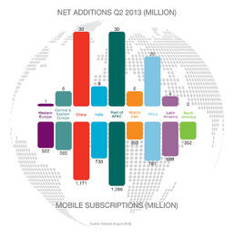 Pomiędzy kwietniem i czerwcem 2013 roku przybyło na świecie 105 mln subskrypcji. Najwięcej w Chinach (30 mln), Indonezji (9 mln), Indiach (8 mln), Bangladeszu (5 mln) i Nigerii (4 mln). Wzrosła również liczba subskrypcji w obszarze mobilnego internet. W ciagu dwunastu miesięcy pomiędzy drugim kwartałem 2012 i drugim kwartałem 2013 roku, liczba subskrypcji mobilnych wzrosła o 45%. Najwięcej nowych subskrypcji uruchomiono w obszarze technologii WCDMA/HSPA (75 mln) i LTE (25 mln).
